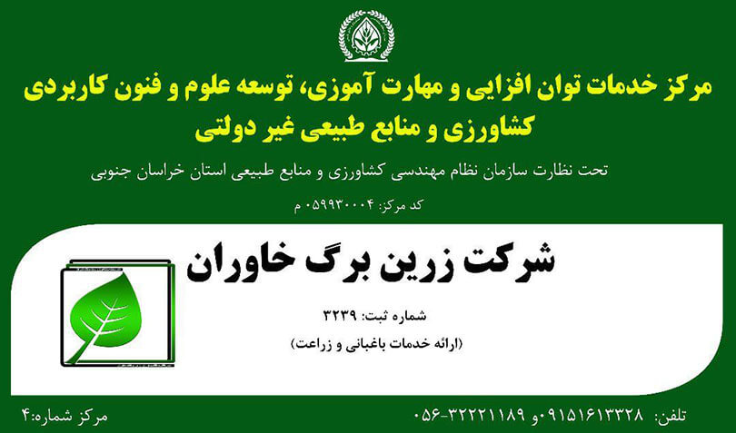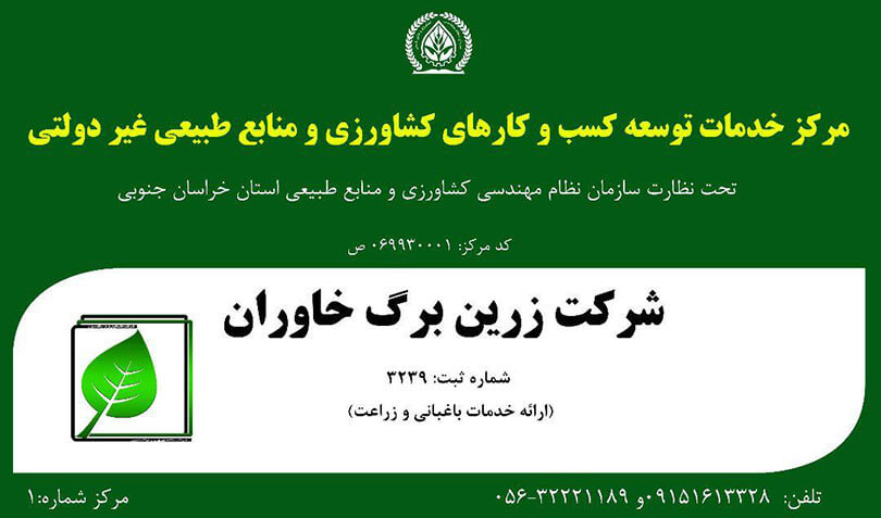 شرکت کشاورزی زرین برگ با اخذ مجوز 5-مرکز خدمات توسعه کسب و کارهای کشاورزی و منابع طبیعی غیر دولتی با هدف اشتغالزایی، اقدام به معرفی پتانسیل های موجود در حوزه های مرتبط نموده است.